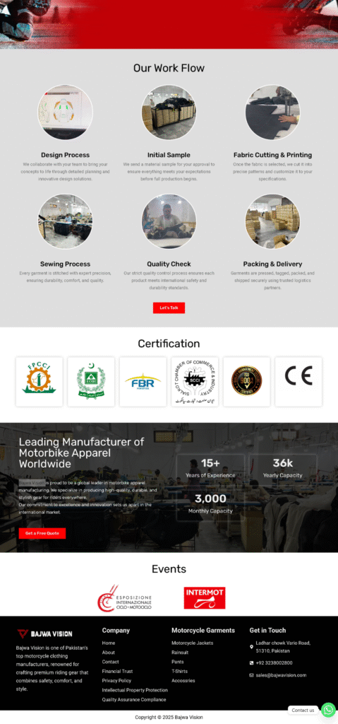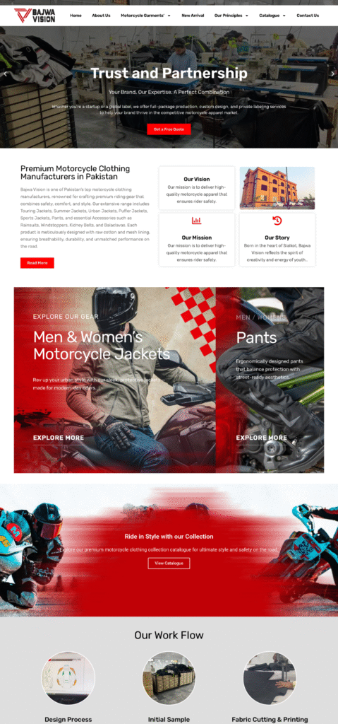 Our task was to design and develop a robust, modern website that showcases Bajwa Vision’s manufacturing capabilities and reinforces its image as a trusted partner in the global motorcycle apparel industry. Key goals included: