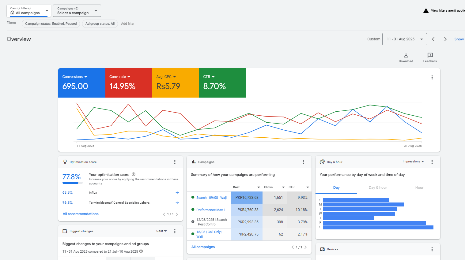 • Ads consistently appeared in the Top 3 results for high-intent pest control keywords.